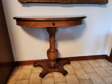 Mobiletto da sala, salotto o camera, in legno di noce, con piano a mezzaluna lavorato e intagliato. Cassetto centrale.