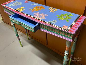 Consolle in legno più specchio. Misure 100 x 30 altezza 86. Misure specchio ovale 90 x 60. Dipinti a mano in stile simil TOM’S DRAG.