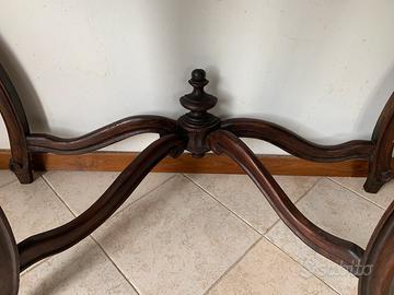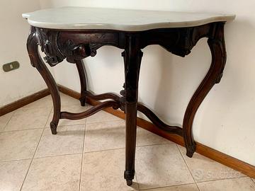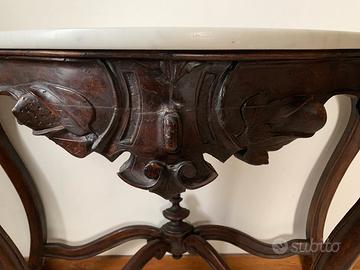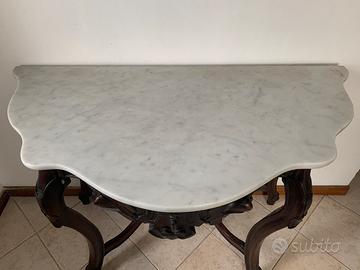 Vendo antica consolle in legno riverniciato scuro, fine ‘800 con piano in marmo bianco, restaurata. Altezza 88 cm larghezza 121 cm profondità 60 cm.
