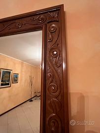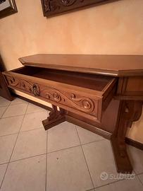 Consolle in legno massello composto da specchio e mobile con un cassetto. Le misure sono: Consolle: altezza 80 cm, larghezza 118 cm, spessore 35,5 cm nella parte più ampia e 22,5 cm nella parte più piccola. Specchio: 85,5 x 70,5 cm con spessore di 3,5 cm.