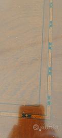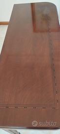 Consolle in legno massello di grandi dimensioni con piano apribile, intarsiato e fregio nella parte frontale, cerniere in ottone e gambe scanalate affusolate. Il tavolo ha un'apertura semplice, con due prolunghe di cm 120*50. La consolle ha diverse misure in apertura, chiusa misura cm 120*45 altezza 80, con il solo piano ribaltato misura 120*90, con una prolunga 120*140 con la seconda prolunga misura cm 120*190. Condizioni buone, usura compatibile con l’età e l’utilizzo.