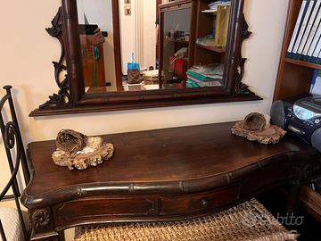 Vendo elegante consolle in legno massello scuro con specchiera coordinata, dallo stile classico e raffinato. I dettagli intagliati e la finitura effetto bambù conferiscono unicità e pregio all’arredo, perfetto per valorizzare un ingresso, uno studio o una camera da letto.