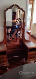 Consolle in noce anni 20 con piano in vetro e cassetti, più due sedie e una panca