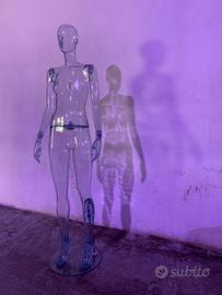 Banco espositivo in plexiglass trasparente e fumé (dimensioni circa 120x100x50 cm), realizzato su misura, dal design moderno e minimale.