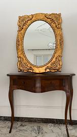 Consolle per ingresso in legno con 2 rispettivi cassetti e specchio con modanature e cornice dorata vintage