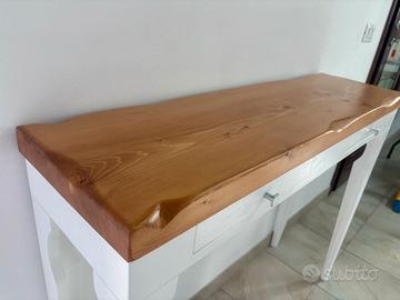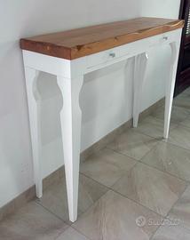 consolle ingresso stilizzato,realizzato artigianalmente in legno massello,con 2 cassetti.finitura bianco e noce.mis. 109x30 H83cm. NO TRUCIOLATO MA LEGNO.ARTIGIANALE