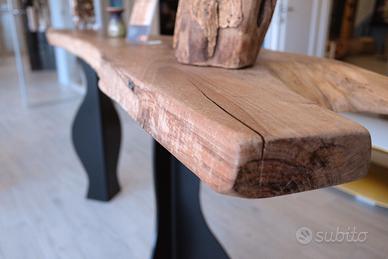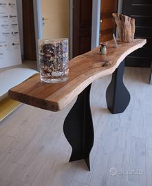 Consolle per uso interno, in stile industriale, gambe in ferro taglio laser, laccate nere verniciate a polvere, top in legno massello Noce nazionale. No spedizione, ritiro a mano, zona Roma Nord.