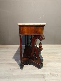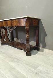 Importante consolle Luigi Filippo in piuma di noce in prima patina. Essa si presenta con le due gambe frontali dalle forme mosse e con il piano in marmo bianco Carrara. Conservata in patina.