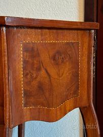 Elegante consolle mobiletto ARTE POVERA in legno intarsiato color noce con decori in metallo e due cassetti. Lavorazione artigianale.
