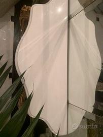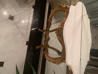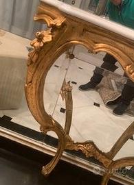 Coppia di eleganti consolle in legno scolpito e dorato di misure contenute ( cm 121 x47 x100). Piano sagomato e marmorizzato in buone condizioni, presenta la pattina del tempo.