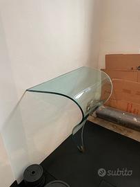 In vendita splendida consolle di modernariato firmata Nicoletti Sova, realizzata in cristallo curvato e molato, sagomata a triangolo e impreziosita da borchie di fissaggio in metallo cromato. Datata 1991 e firmata dall’autore sul finale. Larghezza 90cm, profondità max 50cm, altezza 90cm. Condizioni complessive buone, con lievi difetti compatibili con l’età. Prezzo trattabile.