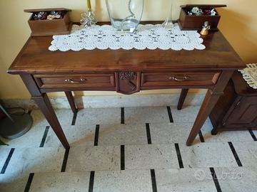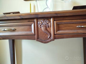 Consolle per ingresso in legno massello noce nazionale con 2 cassetti, inserto centrale raffigurante una cornucopia intagliata a mano completa di cornice con specchio. Mis consolle L 110cm x h 82 cm x prof 47 cm. Specchiera L 60cm x h 80 cm.