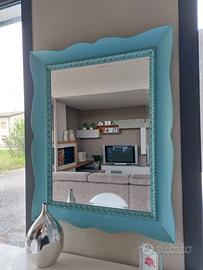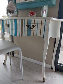 Consolle sagomata in legno e dipinta completa di specchiera sui toni del bianco latte e turchese cm. 100x38