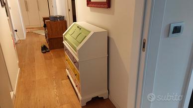 Consolle con scrittoio (calatoia) e cassettiera, accuratamente dipinta a mano con colori acrilici e protezione con vernice trasparente. Dimensioni 85 (l.) x40 (p.) x95cm (h). Perfettamente funzionante, ideale per cameretta o soggiorno.