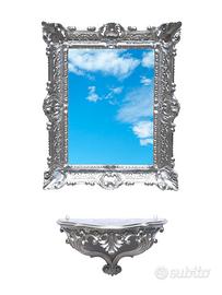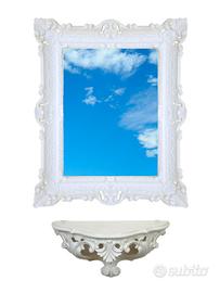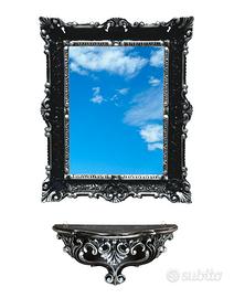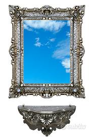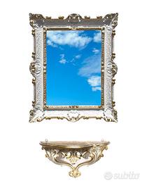 Set composto da specchio dorato + consolle dorata finto vintage in stile barocco Luigi XVI, interamente realizzato in polimero sintetico. La forma è sagomata per entrambi i pezzi e ci sono i ganci posteriori per poterli fissare separatamente alla parete. Simpatico complemento da arredo per chi possiede una casa in stile per arredare simpaticamente con eleganza una parete o un ingresso senza spendere una fortuna. Dimensioni cornice: H 55 cm x L 45 cm - superficie specchio: H 39 cm x L 28,5 cm - Dimensioni consolle: H 20 cm x L 38,5 cm x P 15,5 cm - P.s. Nella foto abbiamo neutralizzato il riflesso dello specchio per poterlo fotografare frontalmente. E' uno specchio vero.
