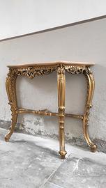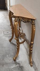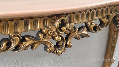 Si tratta di una consolle in stile barocco, caratterizzata da intagli decorati e una finitura in foglia oro. Questo tipo di mobile è realizzato in legno massello e presenta un piano d'appoggio in marmo rosa con venature.