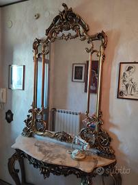 La consolle è il risultato di un elaborato lavoro artigianale. È stata costruita negli anni '50 e lo stato di conservazione attuale è eccellente. Il piano è di marmo chiaro con alcune venature scure, si presenta lucido e liscio al tatto. Tutte le parti in legno sono in massello dorato. Le dimensioni sono: altezza max. 252 cm e larghezza max. 144 cm. Imballaggio e trasporto a carico dell'acquirente.