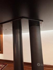 Questa consolle acquistata in un famoso mobilificio trevigiano aprendola diventa un ottimo tavolo. Adatta per chi non ha molto spazio nello spazio living, si adatta sia in un ambiente moderno che classico. Il diametro da chiusa è di 140, 280 da aperta, possono comodamente sedere 6 persone. L'altezza è di 72 cm. Il diametro del piedistallo è 62 cm. Nelle foto 1-2 la consolle è chiusa, nella foto 3 è aperta a tavolo, nelle foto 4 e 5 si vede la struttura che sostiene il piano. Il tutto è molto stabile. Il colore è un bellissimo nero laccato (che presenta qualche imperfezione da usura del tempo), il piedistallo è in ferro nero sempre laccato, il piedistallo in legno laccato sempre nero. Vendiamo perchè non la usiamo più da molto tempo.
