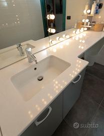 Specchiera con 24 lampadine per una perfetta illuminazione MakeUp professionale misure 168x110 cm - con piano in marmo lungo 190 cm e lavello 46x27 cm - colonna a 5 ripiani larga 25x110 cm - Armadietto sotto il piano 70x57 cm a due porte.
