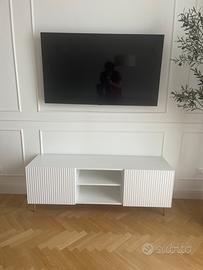 console tv in ottimo stato. Essa é in legno verniciato in bianco con dettagli in oro. essa é composta da 2 scompartimenti interni a scomparsa e uno a vista. Ecco le misure: lunghezza: 155 cm altezza: 55 cm profondità: 42 cm