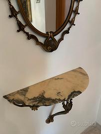 Bellissima consolle vintage anni '40/'50 in ottone dorato molto lavorato e marmo verde e bianco, usata ma molto comoda e in buone condizioni, le sue misure sono la parte inferiore 80 cm di larghezza x 80 cm di altezza, specchio 100 cm di altezza x 50 cm di larghezza, in perfette condizioni. Bellissima consolle anni '40/'50 in ottone dorato molto lavorato e marmo rosa pallido, usata ma molto comoda e in buone condizioni, le sue misure sono la parte inferiore 80 cm di larghezza x 80 cm di altezza, specchio 100 cm di altezza x 50 cm di larghezza, in perfette condizioni.