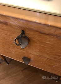 Bellissima consolle anni '50 con rifiniture in ottone. 6 cassetti e doppio ripiano verde salvia con vetri originali. Vendo assieme alla specchiera soprastante, piu antica, con specchi originali e pieghevoli a piacimento. prezzo trattabile MISURE CONSOLLE : larghezza 197 x altezza 78, profondità 47 MISURE SPECCHIERA : altezza 150 x larghezza 130 circa