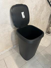 Contenitore molto capiente da 50 litri (modello LÖVKVAST, IKEA), ideale per riporre sia oggetti asciutti che umidi grazie alle piccole aperture sul bordo superiore che consentono di fissare fino a 2 sacchetti contemporaneamente. Perfect per differenziare, oppure semplicemente per tenere tutto in ordine. Il coperchio è facilmente removibile, e gli angoli arrotondati lo rendono facile da pulire