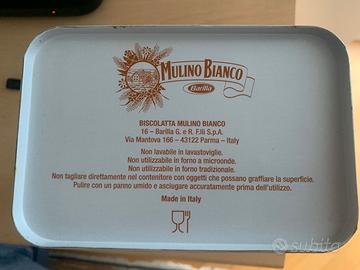 Vendo scatola di latta "Biscolatta" del Mulino Bianco utilizzabile come contenitore biscotti o portaoggetti con design molto particolare con coperchio sigillante apribile e richiudibile in perfette condizioni..