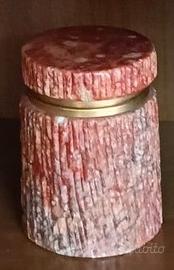 Contenitore vintage anni '70 in alabastro rosso corallo, con lavorazione a effetto corteccia e chiusura in ottone con coperchio a molla. In ottime condizioni, è utilizzabile come decoro o portagioie. Un pezzo pregiato.