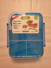Coperchio ermetico con manici per chiusura , 4 scomparti di cui 2 removibili, più uno scomparto per riporre barattolo con chiusura ermetica o altro, 2 posate.