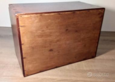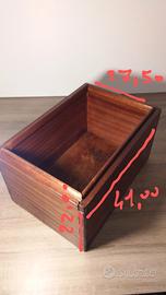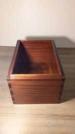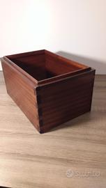 cassa / contenitore, realizzato con tavole di legno Teak, unite tra loro con la tecnica di incastro a coda e rifinito con bordatura arrotondata.