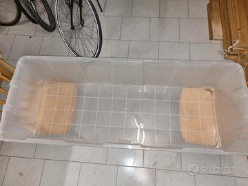 Grande contenitore in plastica trasparente con coperchio e chiusure a scatto; ideale per oggetti/scatole ingombranti; dimensioni 130 L x 50 P x 29 H (ca. 200 litri); il coperchio è rialzato di circa 6 cm facendo guadagnare ulteriore spazio e volume