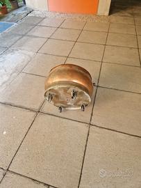 Contenitore in rame con ruote. Eventualmente le ruote sono eliminabili. Sui lati provvisto di pomelli. Larghezza 47 cm. Altezza totale da terra comprese le ruote 32 cm. Altezza senza ruote 26 cm. Epoca 1987. Ripulito, in alcune parti abbiamo preferito lasciare la patina del tempo. Adatto per diversi utilizzi, contenitore per vasi o altro. Peso circa 9 kg.