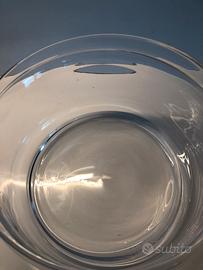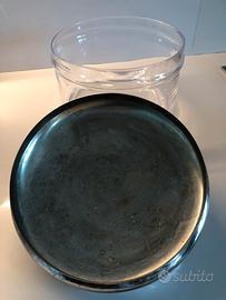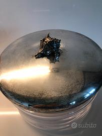 Contenitore in vetro con coperchio in acciaio con decoro di conchiglia. Misure: diametro 24 altezza 16