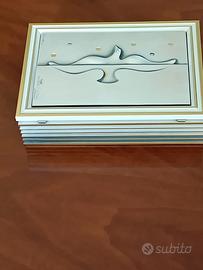 Scatola portagioie "OTTAVIANI" in legno con lamina d'argento 925 - cesellata raffigurante un gabbiano. Rivestita internamente - Certificato garanzia - Dimensioni 9*21*4,5