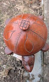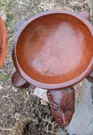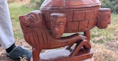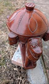 Si apre in alto con un coperchio, ha figure di uomini tribali e un animale sulla parte frontale, mentre dall’alto ricorda una tartaruga.