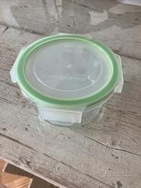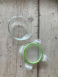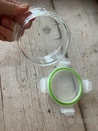 Contenitore ermetico in vetro chiusura clic clac capacità 350 ml, usato pochissimo. Adatto al frigorifero e al congelatore, nonché al forno e al microonde (senza coperchio).