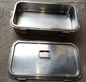 contenitore porta pranzo in acciaio inossidabile struttura resistente con chiusura e maniglie per trasporto misure interne: lunghezza cm.56 larghezza cm.28 profondità cm.11 misure esterne: lunghezza cm.66 larghezza cm. 37 profondità cm.17