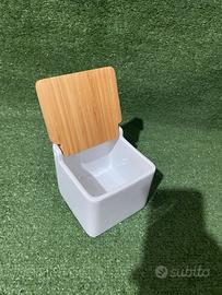 Vendo questo bellissimo porta spezie in ceramica bianca con coperchio in legno di bambù, perfetto per contenere sale, pepe, zucchero, spezie o altri ingredienti da cucina.