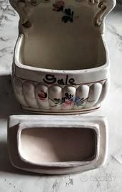 Grazioso contenitore vintage per il sale, realizzato in ceramica con una decorazione floreale dipinta a mano. Un pezzo d'arredo che aggiunge un tocco di colore e nostalgia alla tua cucina.