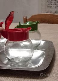 Set di quattro contenitori in vetro con tappi colorati e vassoio.