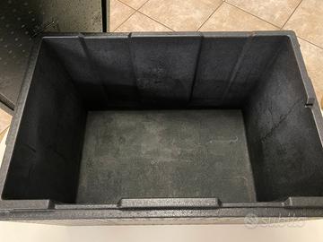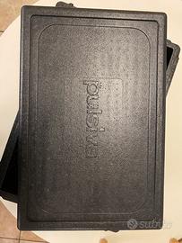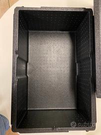 Due contenitori isotermici in polipropilene per il trasporto di alimenti.