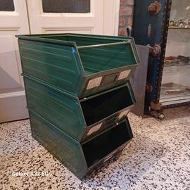 Contenitori vintage impilabili a bocca di lupo in metallo smaltato. Ideali per arredamenti industrial! Risalenti agli anni 70 si presentano in buone condizioni nonostante l'età. Misure 31 x 51 x H. 20 cm. 3 pezzi disponibili, vendibili anche separatamente, prezzo 15 euro ciascuno Visionabili nel nostro mercatino in zona Dergano a Milano @passocarraio.43. Per info 3331006365