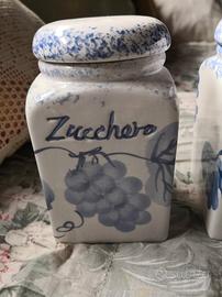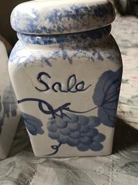 N 2 contenitori in ceramica bianca con disegni azzurri, porta zucchero e porta sale, da cucina, in ottime Condizione come da foto