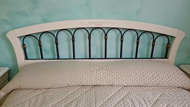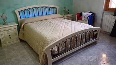 Contorno per letto matrimoniale in stile classico. Composto da ferro antico e legno color panna. Arricchito con luci a led nella parte della testa, come visibile in foto, scegliendo tra 6 colori disponibili. Nonostante l'età risulta in buone condizioni.