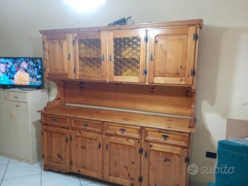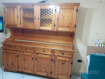 Si tratta di una credenza rustica in pino massiccio con base e alzata, dotata di ante in vetro lavorato e maniglie in metallo scuro.