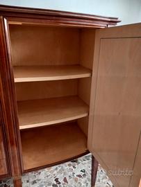 Elegante controbuffet in legno con intarsi: 2 ante laterali, un'anta centrale con apertura dall'alto verso il basso e, all'interno, mensolina di vetro con specchi laterali; 2 cassetti. Lungh. mt. 2,15; largh. max cm.51; altezza mt. 1,38. Prezzo: euro 400. Abbinabile a tavolo coordinato con sedie e a buffet con specchio. Ritiro a carico dell'acquirente.