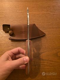 * Fodero Incluso: Viene fornito con un elegante fodero in pelle color cuoio/marrone, perfetto per riporre il coltello in sicurezza o per il trasporto.