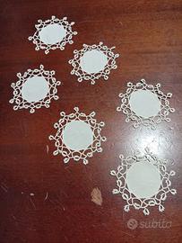 Coordinato di pregio centrini in purissimo lino ricamati a mano a chiacchierino alta qualità e manifattura, 6 pezzi uguali diametro 6,5 cm, nuovi, mai utilizzati DA € 150 VENDO SCONTATISSIMI € 20
