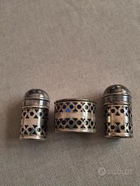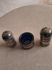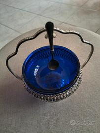 Coordinato da tavola vintage composto da 5 pezzi con bordo traforato a decori geometrici e contenitori in vetro blu cobalto Porta marmellata a cestino, diametro cm 9,5, altezza cm 15 Zuccheriera con coperchio, diametro cm 8, altezza cm 9 Saliera e pepiera, diametro cm 2,5, altezza cm 5 Piccola ciotolina, diametro cm 4, altezza cm 3 Made in England Tenuti bene con un po' di segni del tempo
